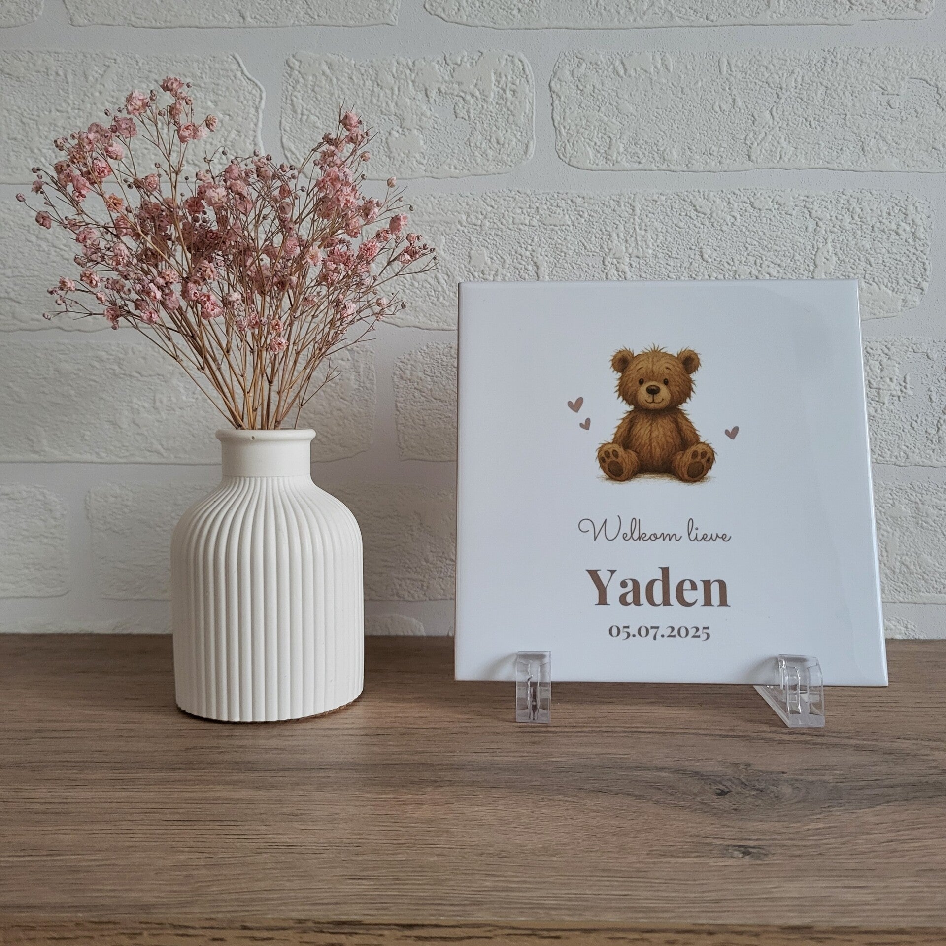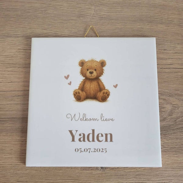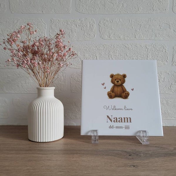 Geef een uniek en blijvend aandenken met deze lieve geboortetegel. Het schattige beertje straalt warmte en vrolijkheid uit – perfect om de komst van een kleintje te vieren.