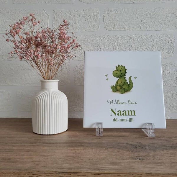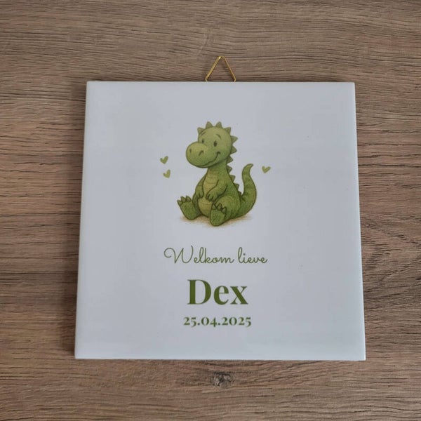Voor de kleine avonturier! Deze geboortetegel met dinosaurus is stoer én schattig tegelijk – een echte blikvanger in de kinderkamer.